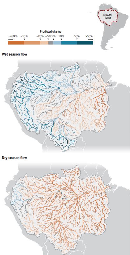 Wetter wet and drier dry seasons may be in store for the Amazon Basin in the final 30 years of this century. Computer modelling suggests annual maximum flows will increase up to 50% in the Amazon River’s headwaters in the Andes to the west; meanwhile, annual minimum flows will decline by 20% to 50% throughout most of the region.